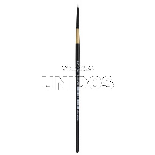 Pincel redondo nº 3/0, con pelo sintético blanco, con una abrazadera sin costuras de color plateado y un mango corto lacado en negro.