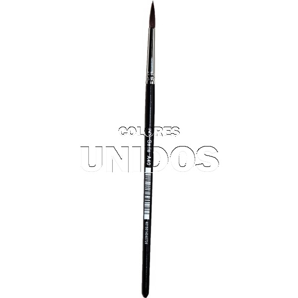 Pincel redondo nº 5, con pelo sintético burdeos, con una abrazadera transparente de color plateado y un mango corto lacado en negro.