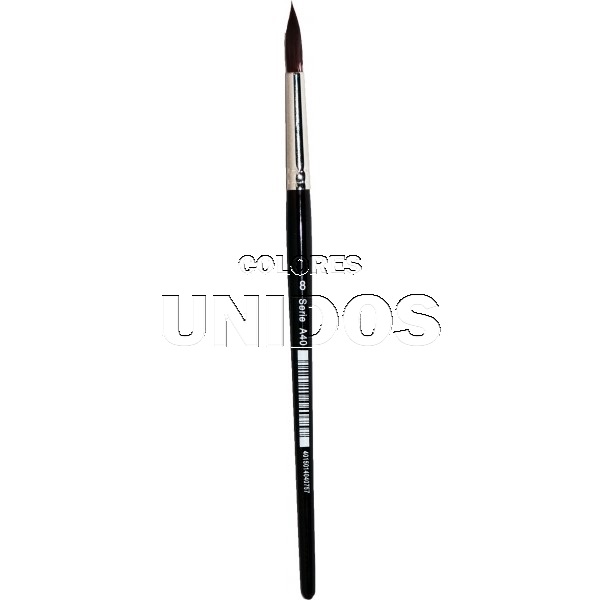 Pincel redondo nº 8, con pelo sintético burdeos, con una abrazadera transparente de color plateado y un mango corto lacado en negro.