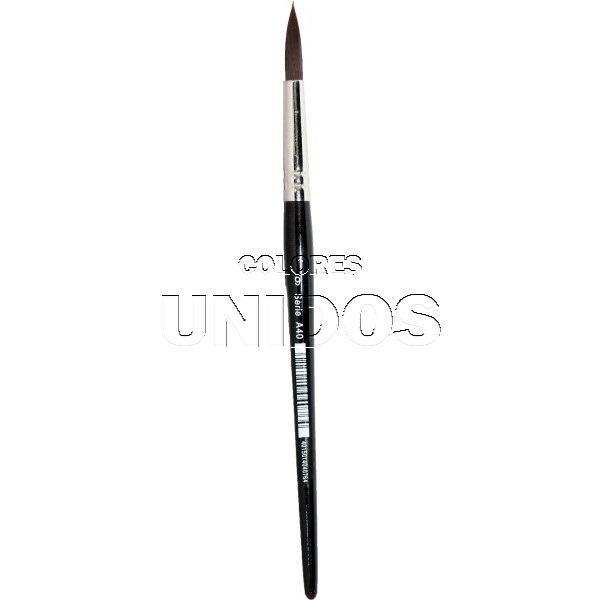 Pincel redondo nº 9, con pelo sintético burdeos, con una abrazadera transparente de color plateado y un mango corto lacado en negro.