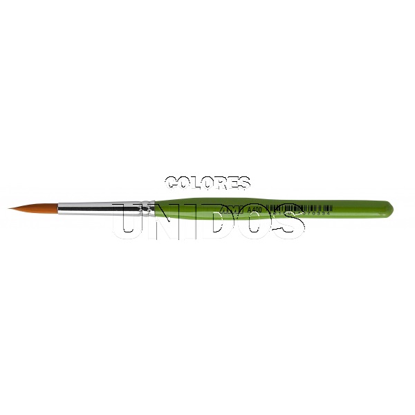 Pincel redondo nº 10 de pelo sintético,con una abrazadera de color plateada sin costuras y un mango corto, pintado de color verde.